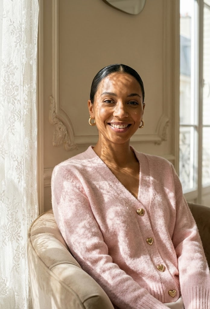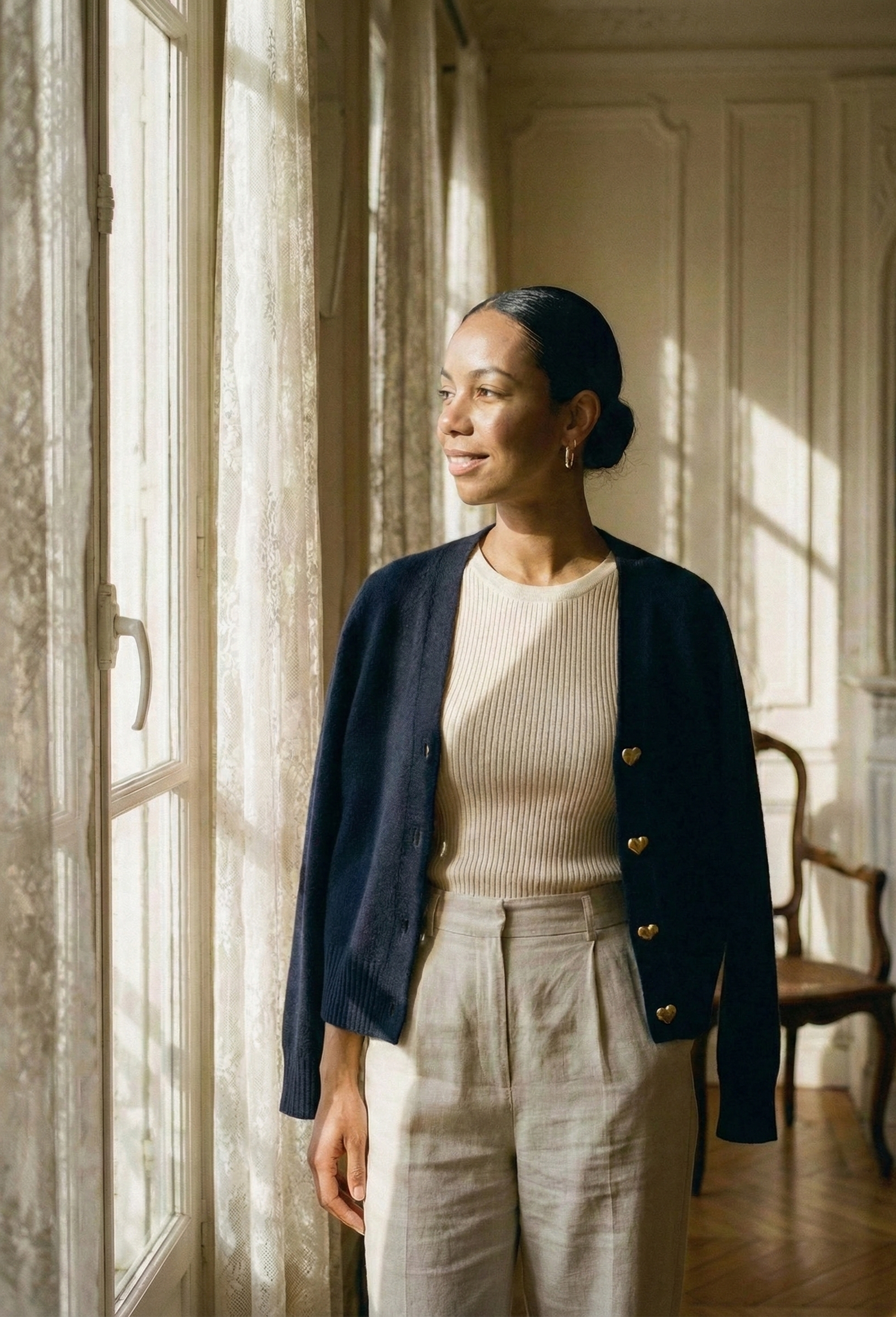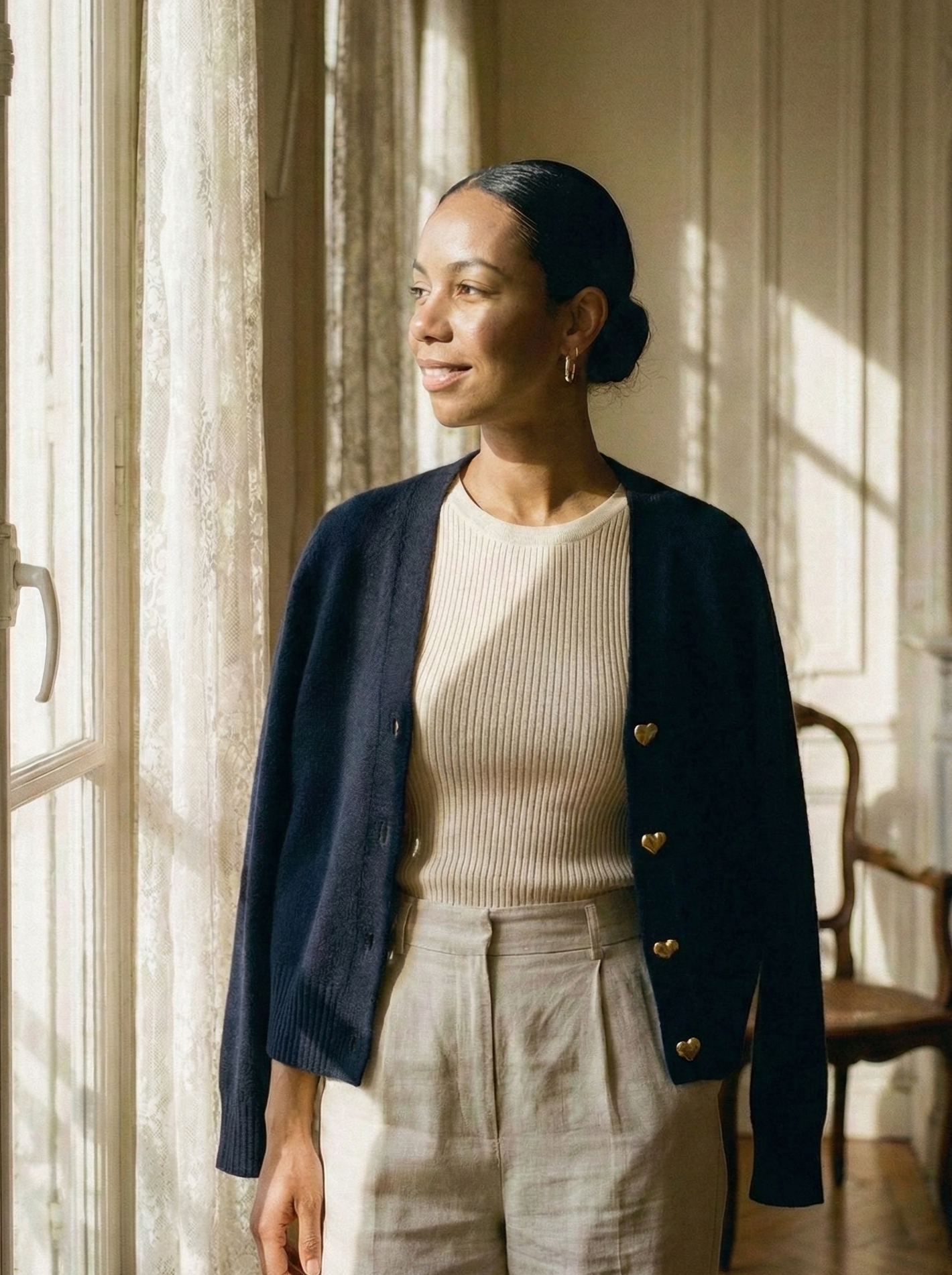 Sa coupe fluide et son décolleté en V subtil mettent en valeur votre silhouette avec une féminité naturelle. L'attention portée aux détails est au cœur de notre création : quatre boutons dorés finement ciselés en forme de cœur viennent fermer le devant, apportant raffinement et classe.